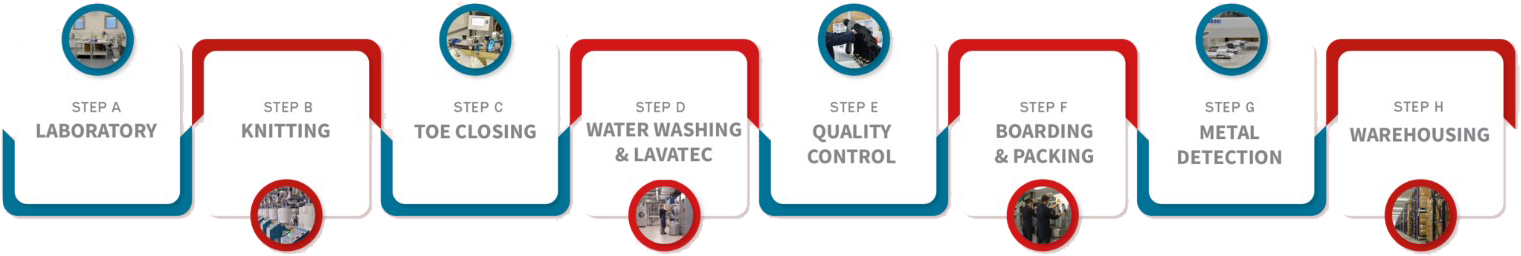 Okyanus Socks possesses state-of-the-art sock knitting machines of various thicknesses (14, 18 gauge) and specifications, as well as water and steam washing machines, steam press ironing machines, and a packaging department distinguished by its high capacity and quality.